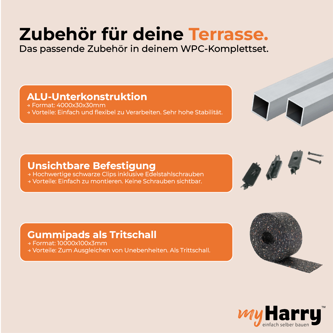 Wer sich den Traum einer neuen Terrasse erfüllen und darauf eine unvergessliche Zeit mit Freunden und Familie verbringen will, ist mit den beliebten WPC-Komplettsets von myHarry bestens beraten. Wir haben dein Set mit höchster Sorgfalt zusammengestellt, sodass es alle nötigen Produkte in ausreichender Menge enthält: Hochwertige WPC-Terrassendielen, eine starke Unterkonstruktion, die Befestigungs- und Randclips inklusive selbstschneidender Schrauben und einer Gummigranulatrolle, welche leichte Unebenheiten problemlos ausgleicht. Dank unserem bewährten Befestigungssystem wird das Verlegen auch ohne Vorerfahrung zum Kinderspiel.