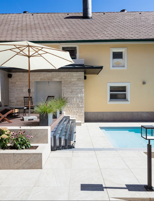 Unsere Terrassenplatten sind frostsicher und rutschhemmend, wodurch sie auch perfekt für Poolumrandungen geeignet sind.