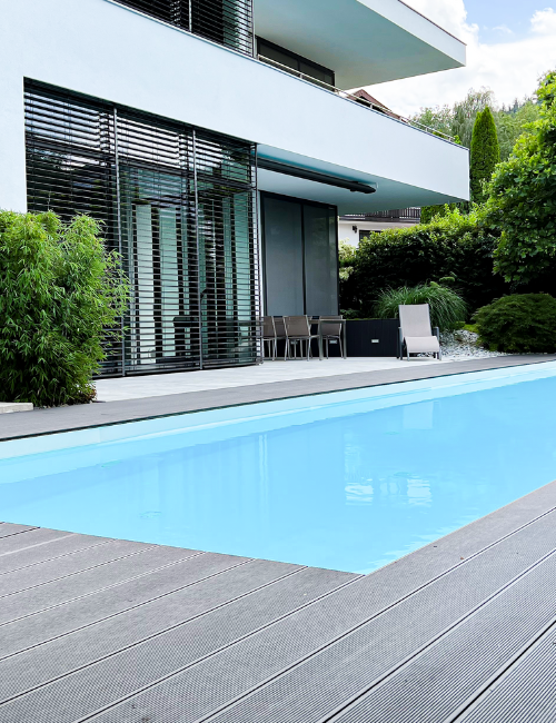 Unsere WPC-Dielen sind splitterfrei und rutschhemmend, wodurch sie auch perfekt für Poolumrandungen geeignet sind.