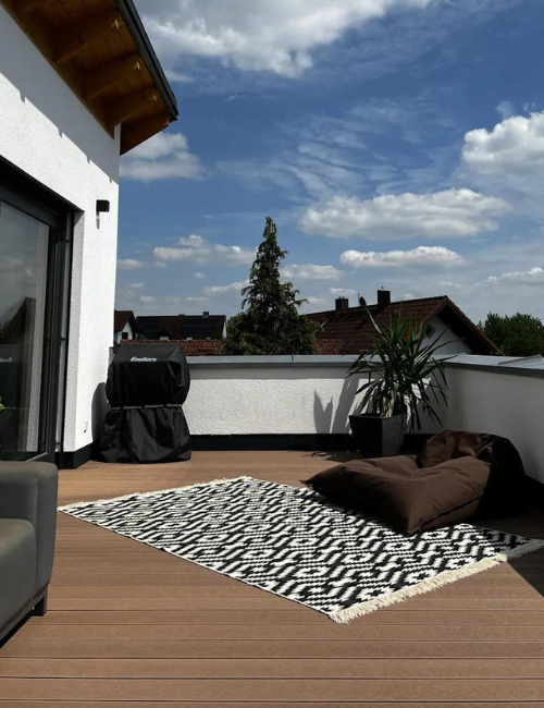 Unsere WPC Terrassendielen trotzen Regen, Schnee und UV-Strahlung, bleiben jahrelang schön und sind resistent gegen Verfall, Insektenbefall und Splitterbildung.